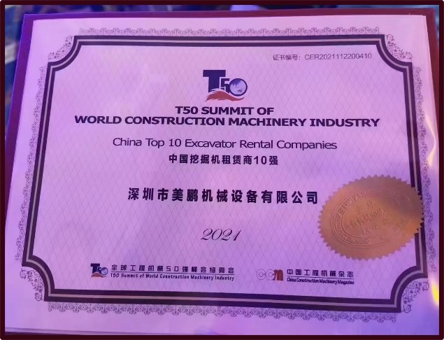 2021年荣获“中国挖掘机租赁商10强”