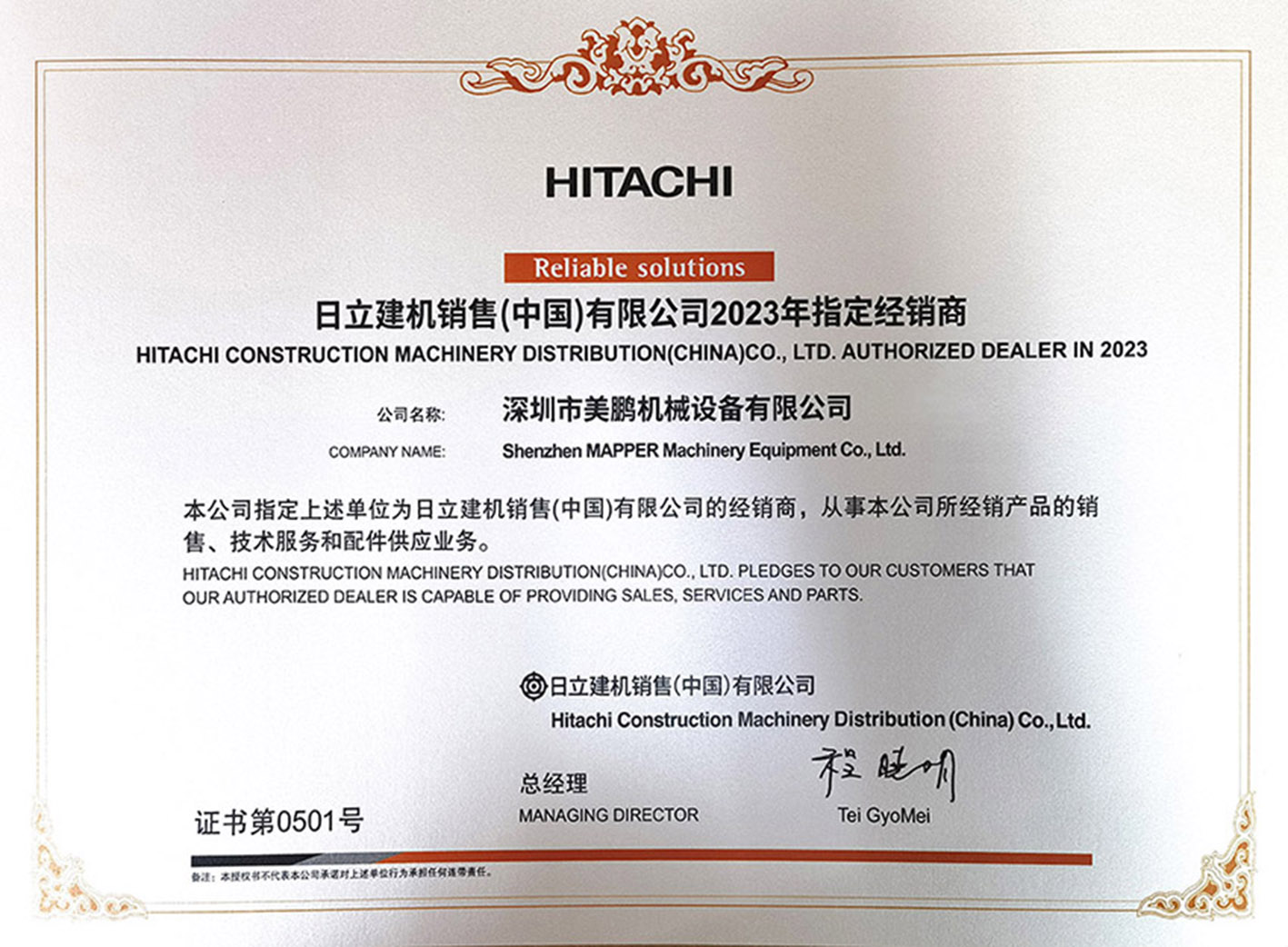 2022年度被日立建机销售(中国)有限公司评为“最佳贡献经销商”